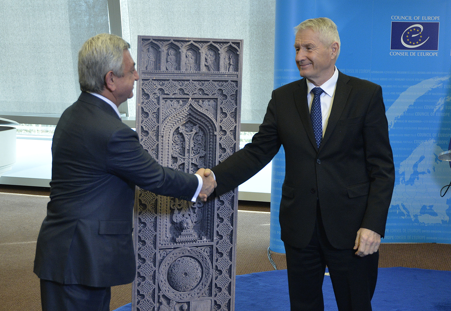 В Страсбурге Президент Армении Серж Саргсян сегодня принял участие в торжественной церемонии преподнесения от имени президента РА Совету Европы официального дара - армянского хачкара. Демонстрационный постер хачкара открыли президент Серж Саргсян и Генеральный секретарь Совета Европы Торбьерн Ягланд. Президент Республики и Торбьерн Ягланд в связи с церемонией выступили с речами. По завершении церемонии президент Республики продемонстрировал Генеральному секретарю Совета Европы, а также участвовавшему в церемонии премьер-министру Дании Ларсу Расмусену хачкар, размещенный во дворе СЕ, на прилегающей ко входу части.