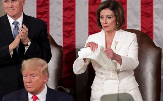In a moment that bookended an already divided night at the Capitol, House Speaker Nancy Pelosi tore in half a copy of the State of the Union address given to her by the president just as he finished speaking, ABC News reports.